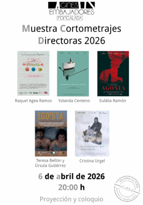 Los Cines Embajadores Foncalada se suman al apoyo del cine español y al impulso del ámbito del cortometraje. Apostamos por el cortometraje como género propio y su exhibición en salas de cine. En esta ocasión, podremos disfrutar el lunes 6 de abril de una sesión con una selección de cortometrajes de ficción realizados por directoras mujeres. La sesión está organizada y conducida por Beatriz Martínez y José Luis Palacios, socios de la Coordinadora del Cortometraje y jurado de público de varios festivales nacionales de cortometrajes.